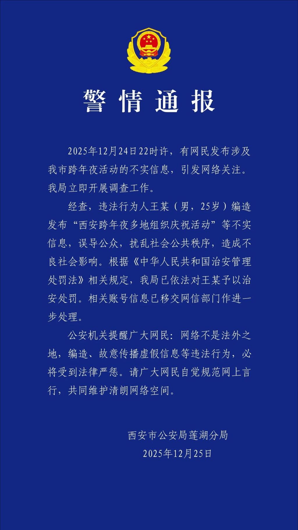 西安市公安局莲湖分局12月25日下午发布警情通报称,2025年12月24日22时许,有网民发布涉及我市跨年夜活动的不实信息,引发网络关注。该局立即开展调查工作。